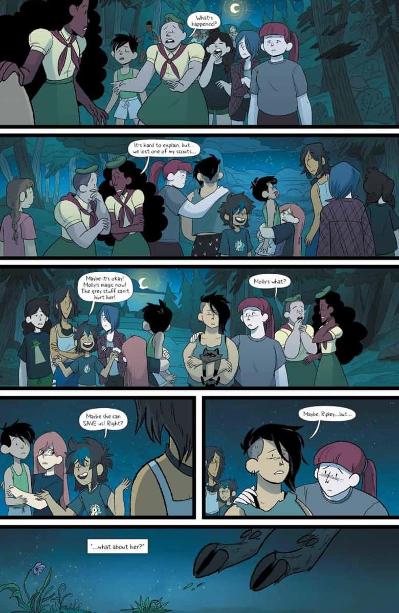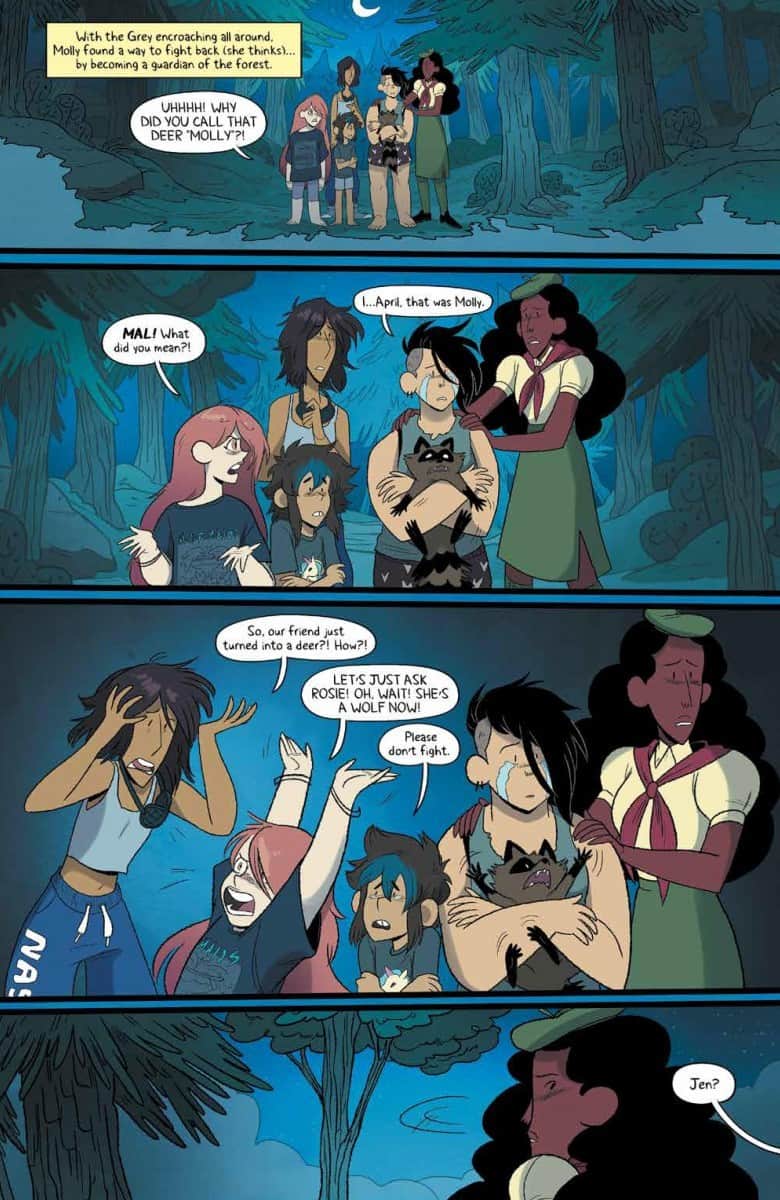 SERIES FINALE! The END OF SUMMER is here in the final issue of Lumberjanes! Co-Creator & Series Artist Brooklyn Allen Returns…along with the Kitten Holy! Now the scouts of Miss Qiunzella Thiskwin Penniquiqul Thistle Crumpet’s Camp for Hardcore Lady Types will have to fight back against the mysterious force known as the Grey! Meanwhile, Molly has discovered a deep and ancient forest magic, which she hopes to use to protect her friends and the home they’ve all found here. Will she be able to, though? Or is this all-encompassing, all-erasing Grey just too much for one ‘Jane to fight on her own?