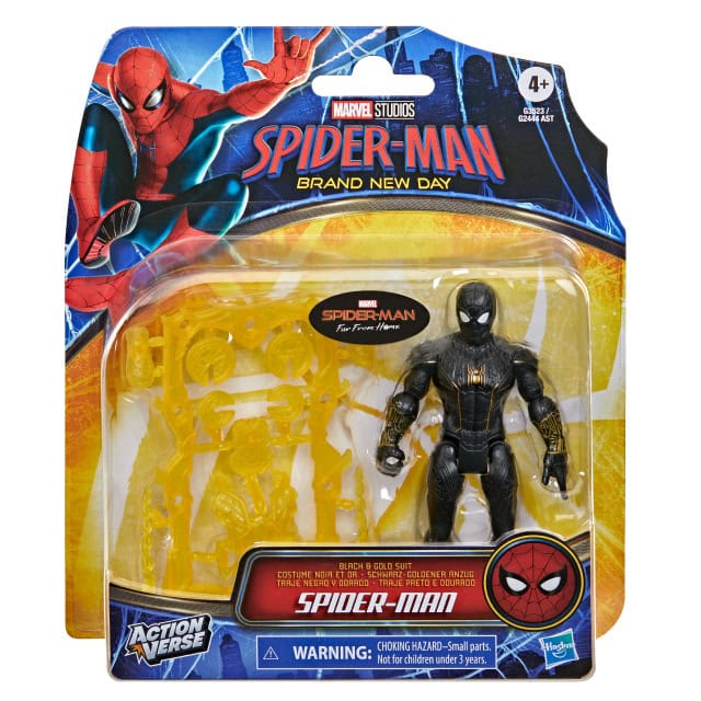 Kids can imagine wall-crawling action and adventure with this Marvel Studios’ Spider-Man: Far From Home ActionVerse Black & Gold Suit Spider-Man action figure. This Super Hero toy comes with 10 detachable accessories, a reusable accessory rack for storage, and features multiple points of articulation for poseable play and display. The figure stands 4.5 inches tall and makes the perfect addition to any web-slinging collection. Look for even more figures, toy sets, and vehicle toys to collect across Hasbro’s ActionVerse, featuring kid-favorite characters and entertainment-inspired design (each sold separately, subject to availability).