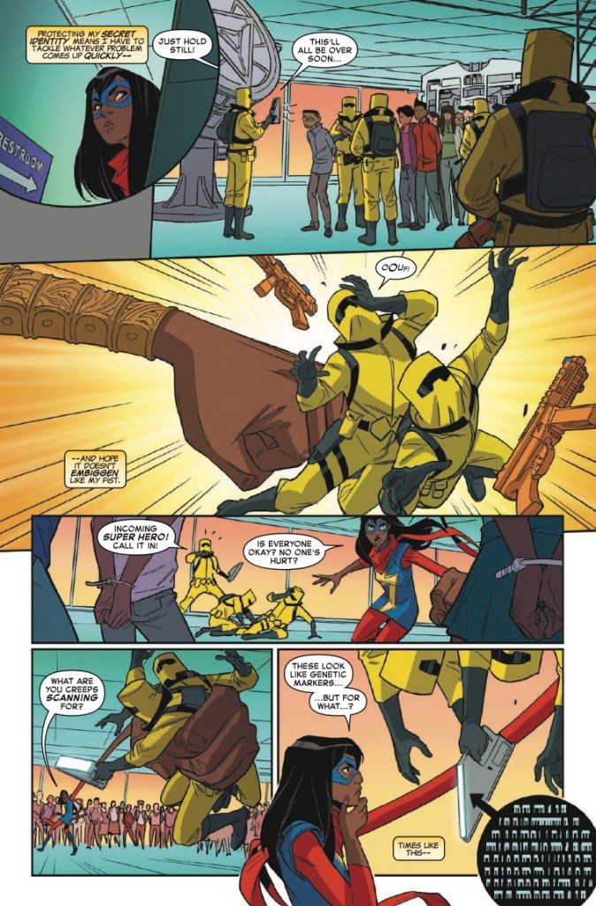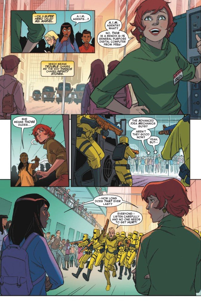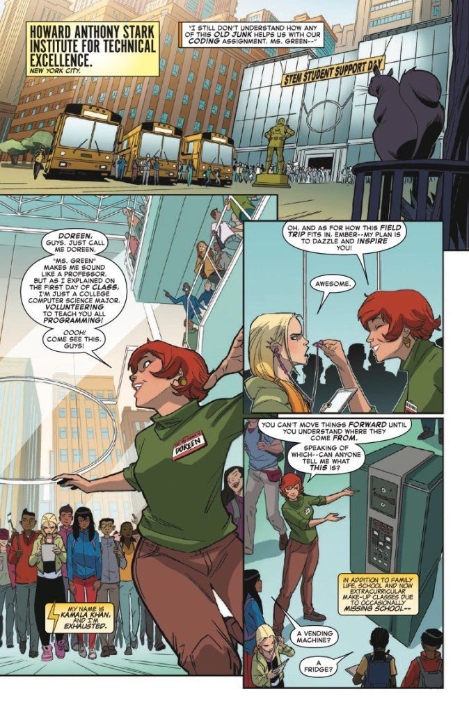 This April SQUIRREL GIRL meets MS. MARVEL – for the very first time! When Doreen Green (also known as the unbeatable Squirrel Girl) volunteers as head counselor for an extra-curricular computer programming camp, little does she know that junior counselor Kamala Khan moonlights as crime fighting super hero Ms. Marvel! But this coding camp is more than just ones and zeros when A.I.M. makes an appearance! Will our heroes be able to save the campers without blowing their secret identities? Join Ms. Marvel, Squirrel Girl, America, Inferno, and Patriot as they learn exactly what it means to be a young hero in the Marvel Universe – and what it means to be a hero to each other.
