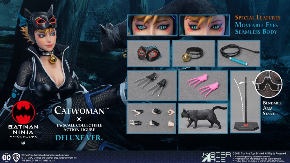 This new 1:6 figure from Batman Ninja features ninja Catwoman as she appeared in the animated movie. The head features moveable eyes for a more expressive look. A tight mesh catsuit fits over a seamless body with over 30 points of articulation. She also comes with a removable mask, ninja armor, and her whip and hand claws.