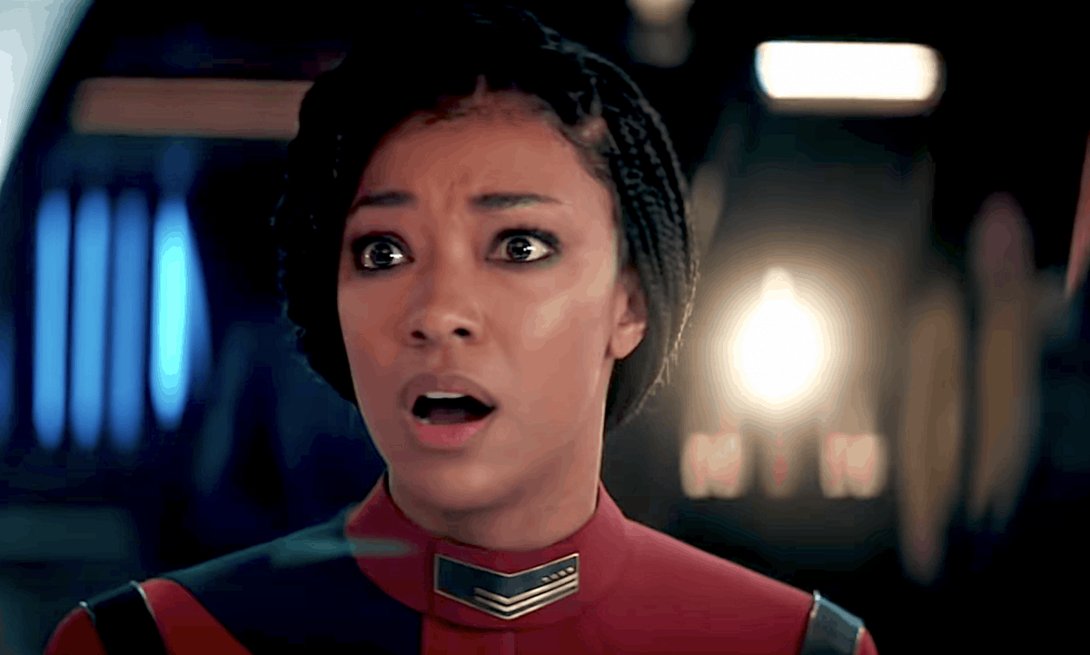In the tease you can see below, the USS Discovery crew is facing off against a gravitational anomaly that’s five light years wide. We also see Burnham (Sonequa Martin-Green) taking the captain’s chair in a new red uniform. She warns the crew of the threat, though, giving a grim tease of the crew’s upcoming battle. “We are facing something we don’t understand, something that could tear us all apart,” says Burnham.
