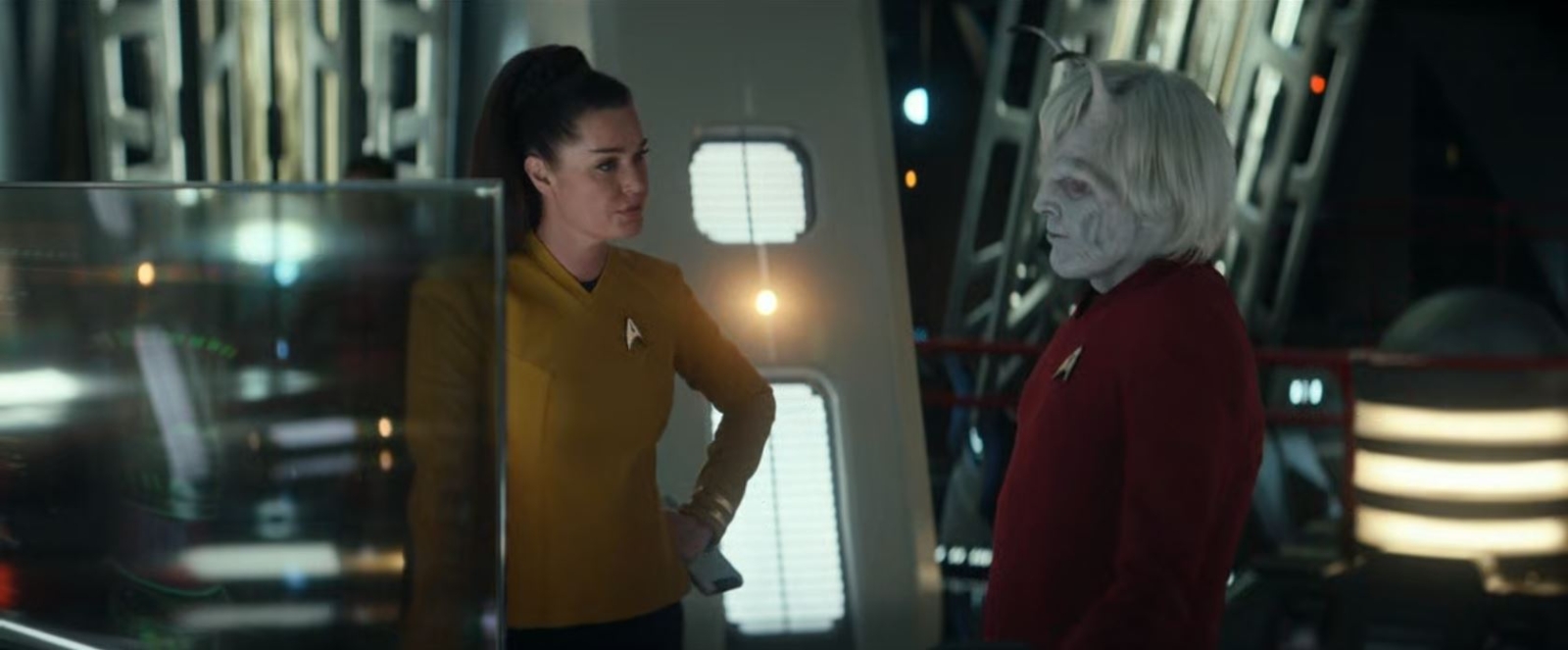 “Ghosts of Illyria” correctly recognises that mystery alone can’t define a character, and begins to give Commander Chin-Riley some substance. While the reveal about her heritage is, ultimately, inconsequential, and the fact she isn’t human is little more than a mild surprise, the episode does enough to give the audience a strong sense of who the character is. Most of all, the episode shows that she feels so passionately about Starfleet and its values and its mission, that she is willing to contravene its rules to be a part of it. That in itself is a fun and thought-provoking moral paradox, and one that could have been explored more thoroughly.