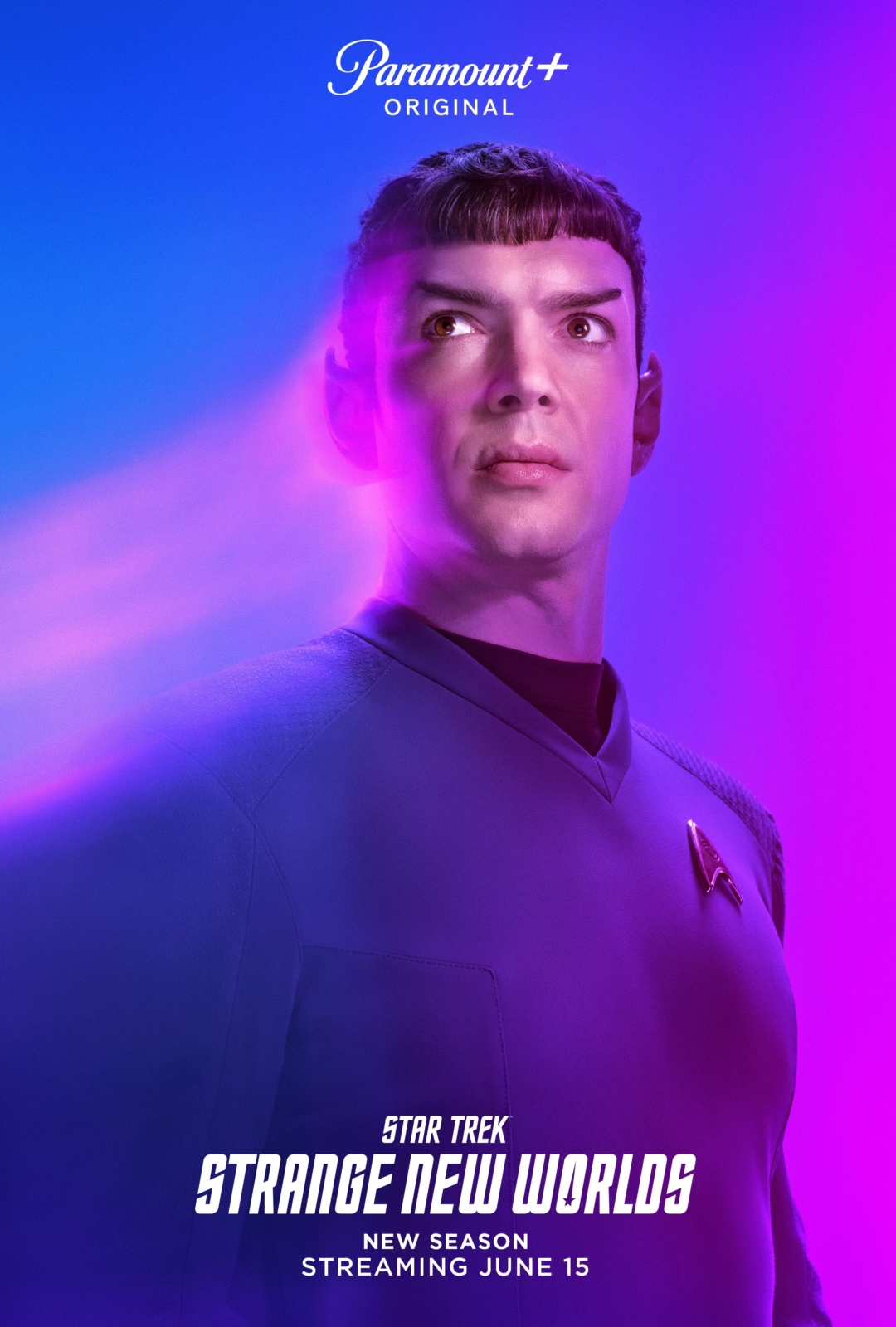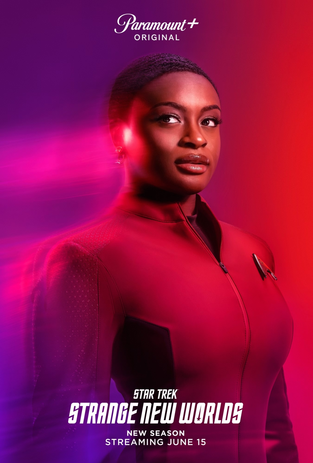 Paramount+ has released eight character posters for the second season of the sci-fi spinoff series Star Trek: Strange New Worlds, featuring Captain Pike (Anson Mount), Number One (Rebecca Romijn), Spock (Ethan Peck), Nyota Uhura (Celia Rose Gooding), La’an Noonien-Singh (Christina Chong), Christine Chapel (Jess Bush), Dr. M’Benga (Babs Olusanmokun), and Erica Ortegas (Melissa Navia). Check them out here…