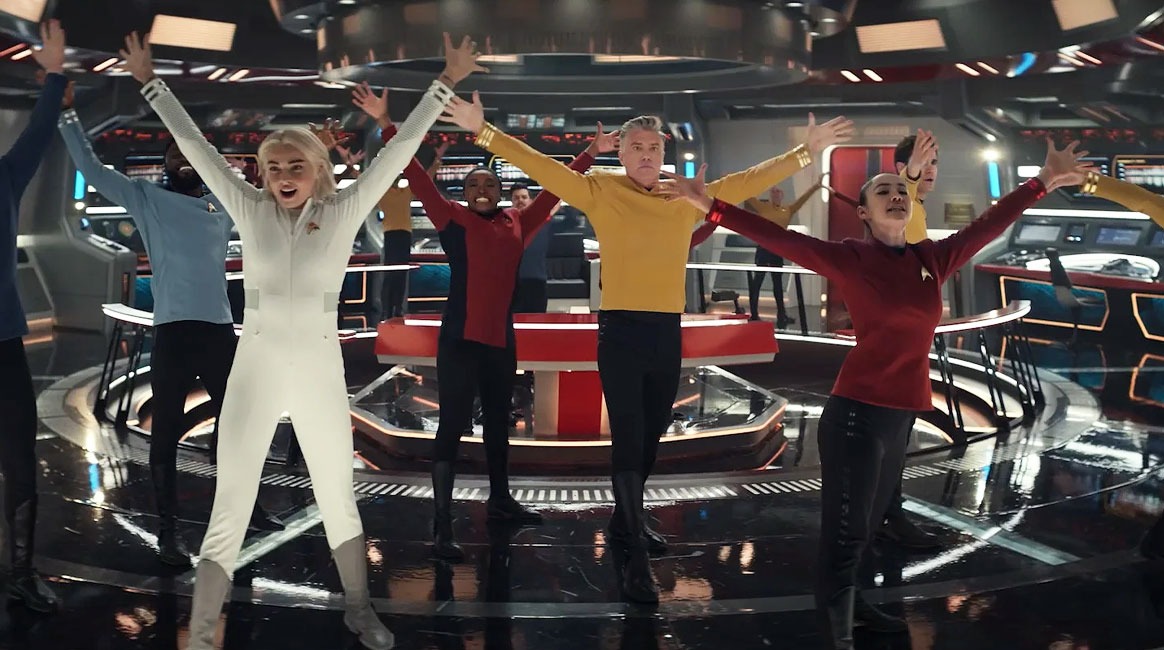The scenario arises after Uhura and some of the crew listen to the old Jazz standard Anything Goes, creating an improbability field where the Enterprise crew spontaneously start singing about their emotions. This seems to mirror the events of a musical. Rather than make light of what is a seemingly preposterous plotline, all involved double down on the story-beats and how to integrate this into the overarching themes and narratives of the season.