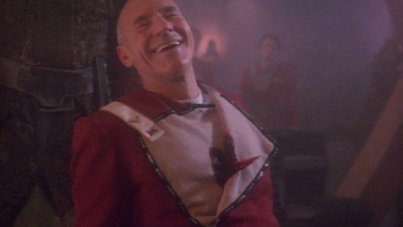 One interesting aspect to ‘Tapestry’ is Q’s involvement and whether or not he was really there with Picard. As a near-death experience, it might have just been a dream Picard had as the crew revived him or Q just saw the opportunity to mess with Picard. Some reasons to think Q was just a figment of Picard’s imagination is how, despite all of Q’s usual eccentricities and sarcasm, he seems rather un-Q-like as he acts as more of a guide to the captain and seems to genuinely want to help him understand the impact of his choices, both the one leading to his stabbing and the one to wish it away. However, at this point in the series Q had become less of an antagonist to Picard and more of an annoying trickster who saw Picard as a friend. Through his few appearances Q’s interest in Picard changed slightly where he gave Picard and the Enterprise a helping hand, albeit in his own way. Either way, John de Lancie makes his appearance a very entertaining one as he goads Picard and takes a few different appearances to great hilarity, comically being a mailman asking for “John Luck Pickherd”.