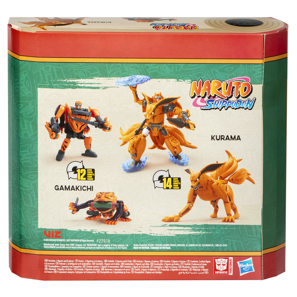 The worlds of TRANSFORMERS robots and NARUTO collide with the TRANSFORMERS x NARUTO SHIPPUDEN mash-up pack! Inspired by the characters from the NARUTO SHIPPUDEN anime series, this 2-pack features the iconic Kurama and Gamakichi characters as TRANSFORMERS robots. The Kurama figure converts between robot mode and 9-tailed fox mode in 14 steps, and the Gamakichi figure converts between robot mode and toad mode in 12 steps. Includes 2 kunai, 2 chakra plates, rasengan, rasenshuriken, and 2 swappable hands for the Kurama figure, and sword and summoning scroll for the Gamakichi figure.