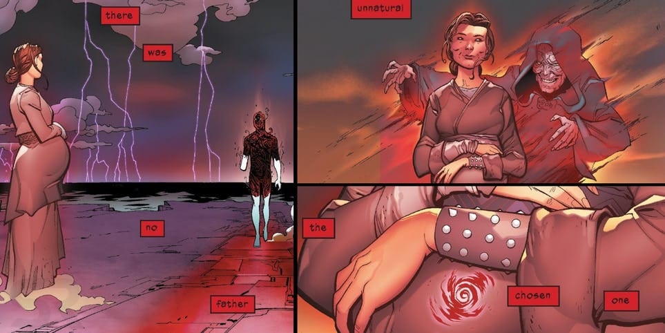 Well, Shmi Skywalker mightn’t have been able to explain Anakin Skywalker’s conception, but Marvel Comics’ Star Wars: Darth Vader #25 has done just that, confirming a long-held fan theory in the process.