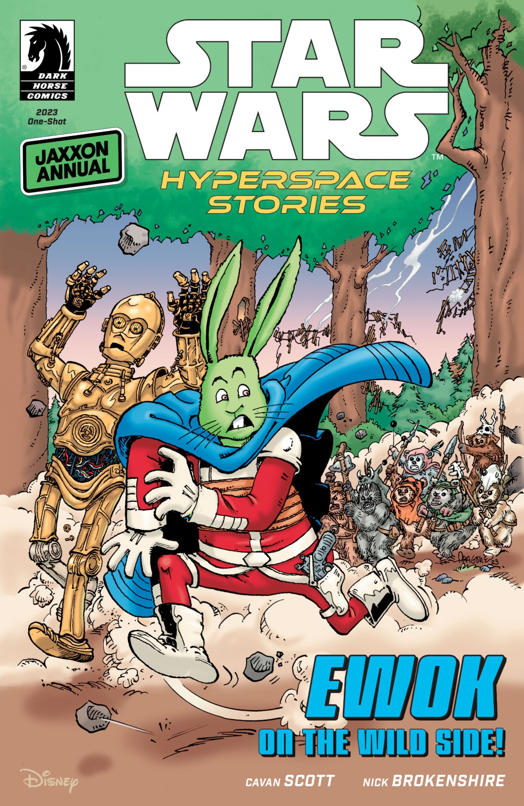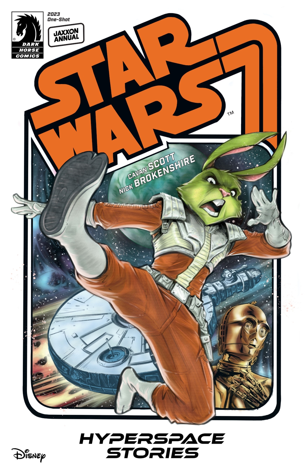 Star Wars: Hyperspace Stories Annual  – Jaxxon 2023, is written by Cavan Scott (Star Wars: Tales from the Rancor Pit), with art by Nick Brokenshire (Star Wars: Hyperspace Stories), colors by David Kennedy (John Carpenter’s Tales of Science Fiction: Vortex), and letters by Comicraft.