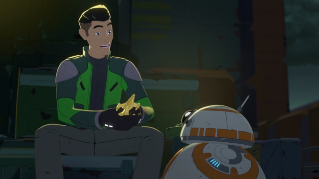 ‘Triple Dark’ mostly dealt with Kaz settling into his new role as a regular mechanic on Colossus, but he was very eager to start his real mission as a spy for the Resistance and track down the First Order’s informant. Most of the episode’s humour derived from him through his attempts to blend in while being covert or knowing next to nothing about being a mechanic. Through this, the episode picked up on a couple threads left from ‘The Recruit’ as Kaz had to deal with the fact he still owed credits to some of the Colossus’ less reputable citizens. Kaz’s characteristics are bit more on display as he improvises his escape against these thugs as well as an attack on the station from a band of pirates. Kaz also reveals an attachment to a trophy he carries around with him that signifies his first win at a race when he was younger, which tells us his boast at being a great pilot is more than that. However, one piece of information in that reveal is how his father didn’t want him to compete, but he did it anyway to prove his father wrong. This subtle acknowledgement further emphasized Kaz’s difficult relationship with his father that was alluded to in the premiere as well as his somewhat annoying drive to prove himself to the Resistance, a fact which deepened his character a bit more.