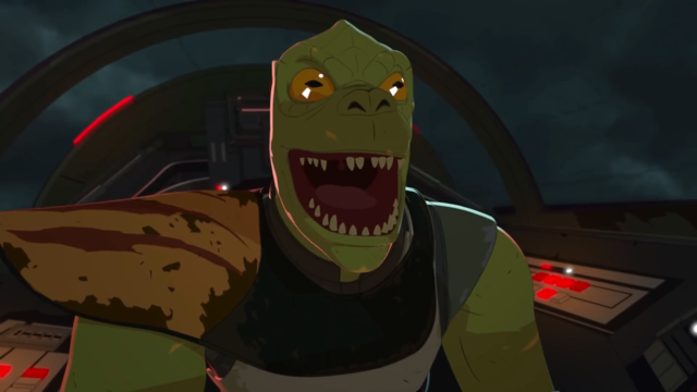 There was a little bit of action in here as well which placed the story in a bit more of a traditional Star Wars story as Kaz and the pilots had to defend the station from a band of pirates. While the animation still takes a bit of getting used to, the aerial battle was well choreographed and entertaining, but also showed the races for the pilots are more like training for them for situations just like this. The designs of the pirates were also cool, showcasing them wearing old and valdalized Imperial or Rebellion-era armour It was an interesting choice, though, to keep Kaz grounded during the battle and while he never took to the sky himself, the show used the opportunity to highlight how thoughtful he could be from the ground as he managed to incapacitate the pirates’ communication systems. Another rather bold choice was not giving Kaz the credit for saving the day, showing how he had grown a just a little beyond needing the acknowledgement for how good he is by keeping his civilian cover intact to his colleagues.