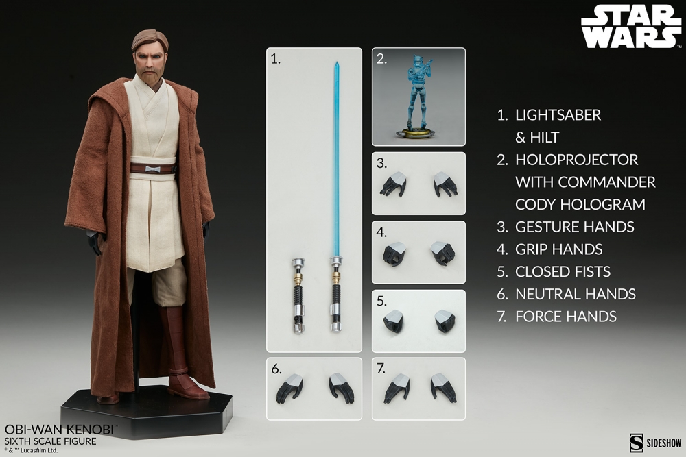 The Obi-Wan Kenobi Sixth Scale Figure includes a number of stylized hands and swap-out accessories to give collectors a wide range of display options for the Jedi general. Obi-Wan Kenobi comes with four pairs of stylized hands including a pair of grip hands, a pair of neutral hands, a pair of force hands, and a pair of fists for a wide variety of gestures and pose combinations. In addition, he comes with both a lightsaber hilt and lightsaber with its blue tapered blade unleashed for battle action. Finally, Obi-Wan includes a holoprojector accessory with a sculpted Commander Cody™ hologram for communicating with the loyal Clone Trooper.