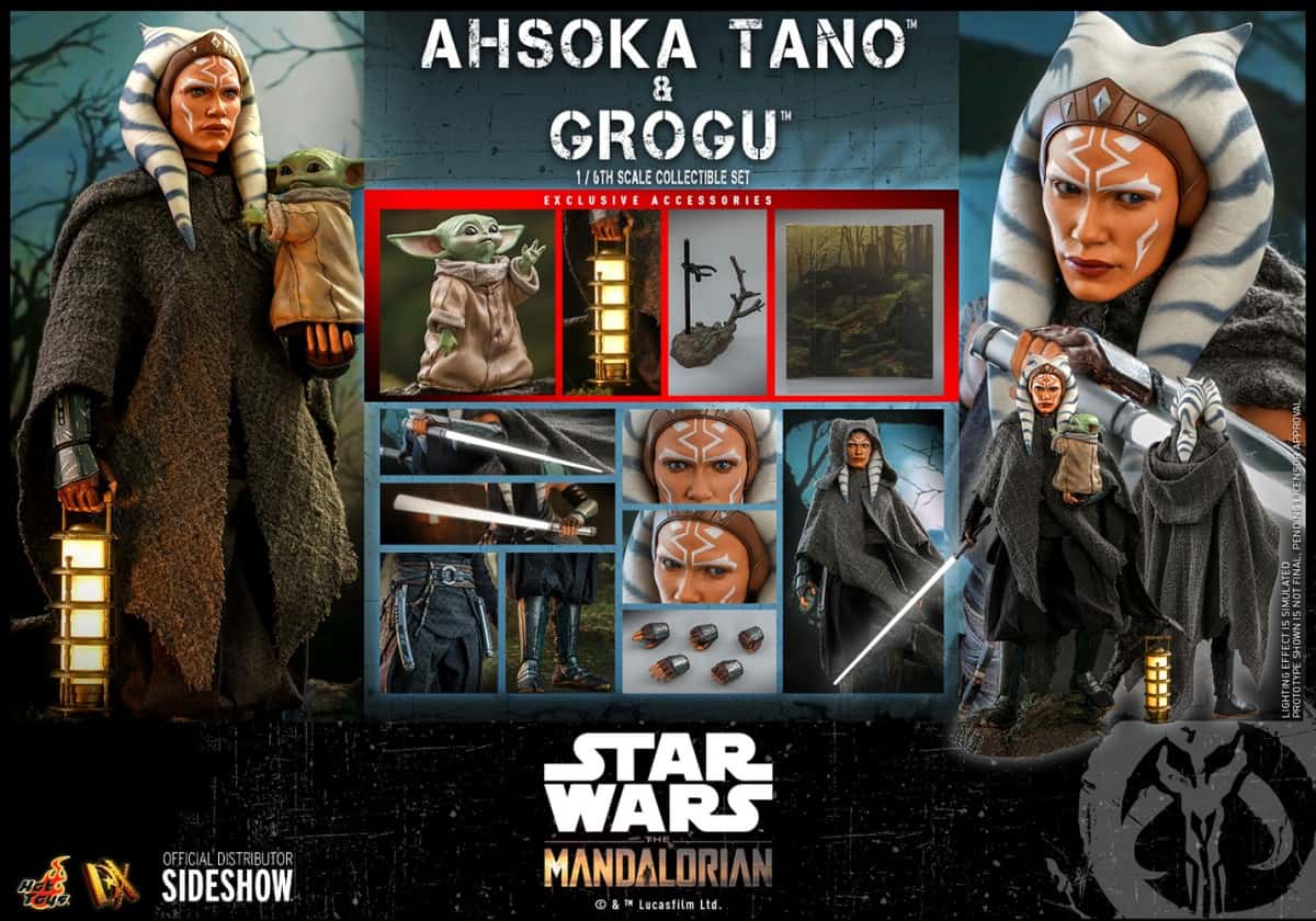 The highly-accurate Ahsoka collectible figure features a meticulously crafted head sculpt with separate rolling eyeballs features and articulated head-tails, specialized physique, skillfully tailored outfit with fine details, a pair of lightsabers, interchangeable lightsaber blades emulating the weapon in motion, and a cloak. The Grogu collectible figure is featuring a newly developed head sculpt with great likeness, articulated head and arms.