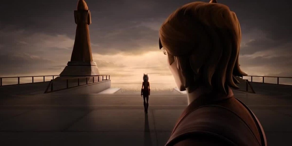 The original finale to The Clone Wars was a rather bleak one. Ahsoka found herself framed for a terrorist act and went on the run to prove her innocence. Before she was proven innocent the Jedi Council expelled her, essentially throwing her under the bus to save face instead of defending her and launching their own investigation. In the end, it turned out another padawan had become disillusioned with the Jedi Order and was responsible for the crimes and frame job. Ahsoka was welcomed back to the Order, but, to the surprise of Anakin and the other Council masters, Ahsoka decided to leave for good.
