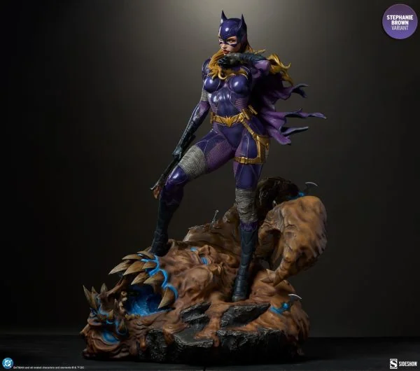 The polystone Batgirl (Stephanie Brown Variant) Premium Format™ Figure measures 21.5” tall x 15” wide x 14” deep. Inspired by the characters’ comic book appearances, this collectible is fully sculpted to capture everything from her costume details down to the varied textures of Clayface’s body. Cloth-like bandages wrap Batgirl’s arms and legs, while her tactical purple Batsuit is accented with armored gold elements like her gauntlets, boots, and utility belt. Her outfit is weathered to reflect the perils of crimefighting in Gotham City, and a tattered cape flutters off her shoulder. Below her, Clayface alternates between melting, muddy ooze and dried, cracked dirt where the Batarangs have zapped him.