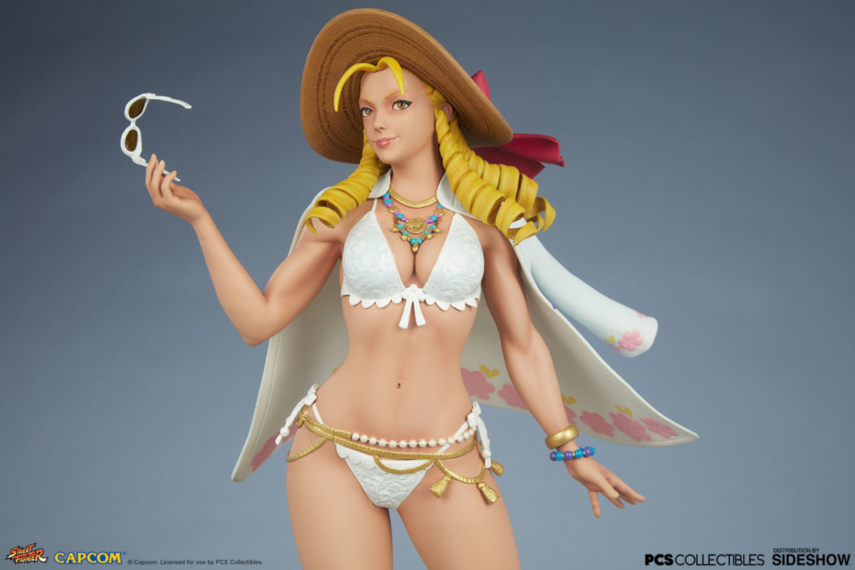 Faithfully recreated based on her in-game character model, Karin’s summer costume is entirely sculpted and features a breezy white jacket and a patterned bikini. The Kanzuki heiress has a toned, athletic physique and decorative, colorful jewelry including necklaces, bracelets, and strapped sandals. Her portrait is detailed with large, perfectly curled blonde ringlets beneath a wide-brimmed sun hat with a large pink bow, completing Karin’s posh ensemble.