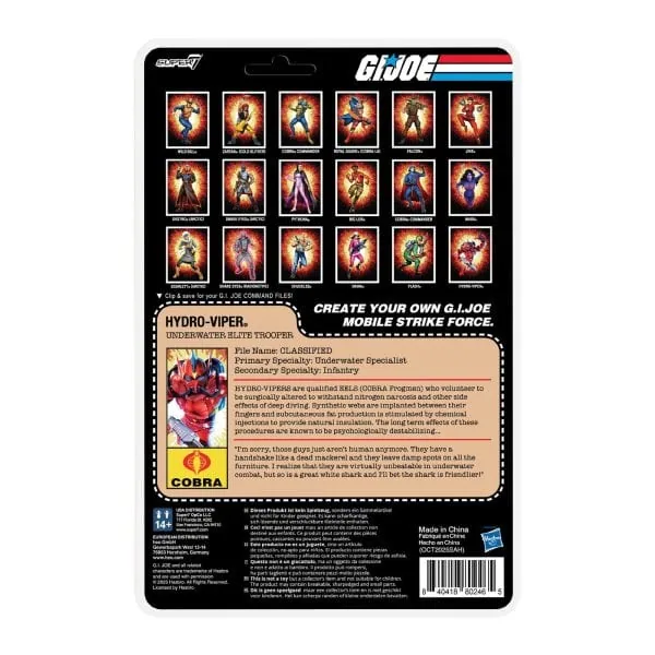 Cover the furniture. It’s been said that the Hydro-Viper makes a mess and that great white sharks are friendlier. Meet the Hydro-Viper as a ReAction+ Figure. Inspired by his appearance in the G.I. Joe: A Real American Hero comic books from the ‘80s, this 4” scale collectible has 12 points of articulation for ultimate poseable possibilities. The Hydro-Vipers are part of Cobra’s elite underwater troopers, surgically altered to withstand the effects of deep-sea diving. Synthetic webbing was implanted between their fingers, making them highly adaptable to underwater combat missions. This ReAction+ Figure features premium paint and intricate sculpting details to bring this menacing creature to life. Accessories include an oxygen tank, a spear gun, and two flippers. The Hydro-Viper ReAction+ Figure comes in blister card-back packaging, with original Super7 artwork influenced by the series. Hurry to collect this formidable foe for your collection to see what fun surfaces next.