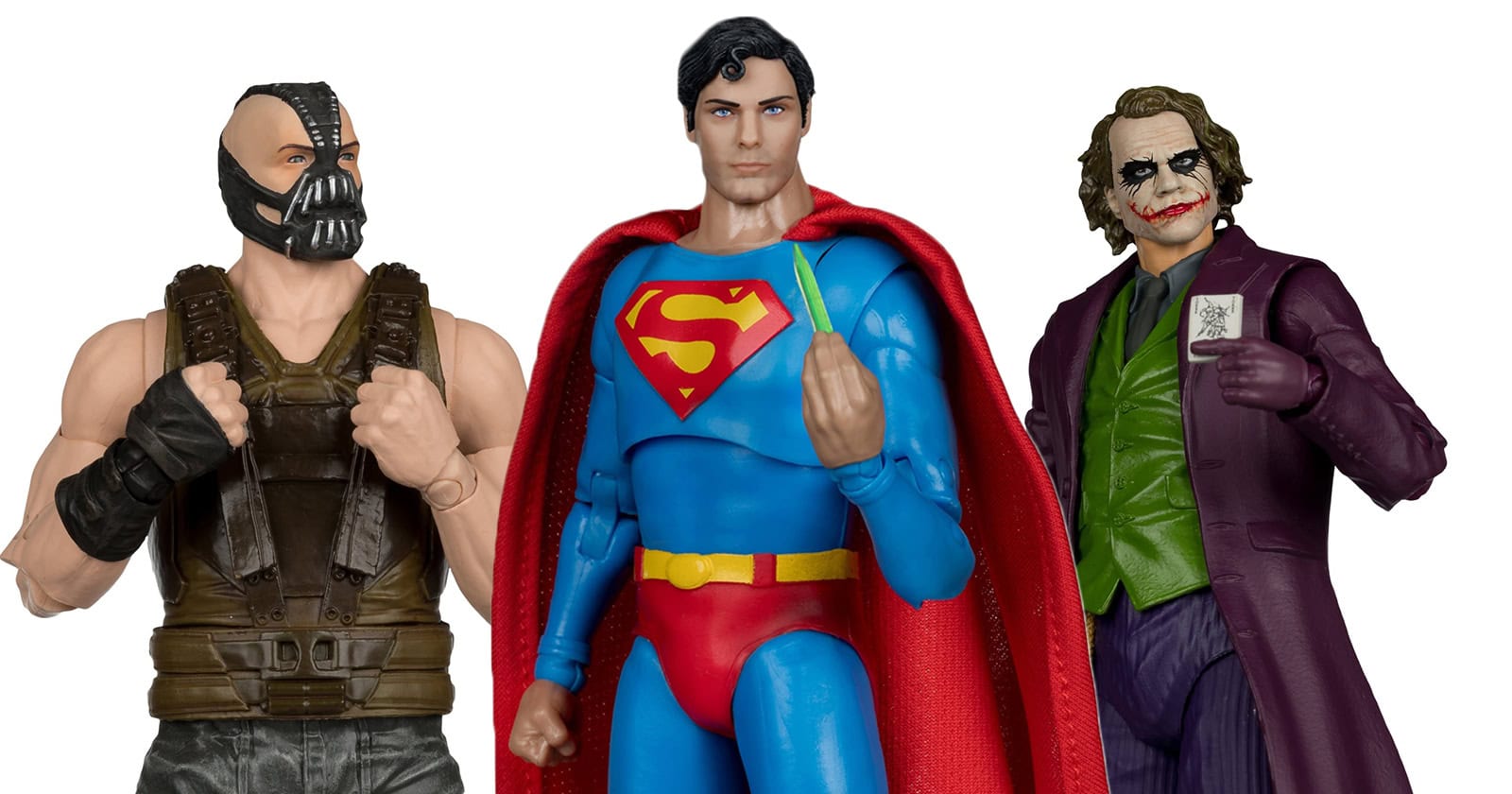 McFarlane Toys has unveiled three collectibles to its DC Multiverse line with Deluxe Theatrical Edition action figures for Christopher Reeve’s Superman from Superman: The Movie, Heath Ledger’s Joker from The Dark Knight, and Tom Hardy’s Bane from The Dark Knight Rises. Check out the promotional images below…
