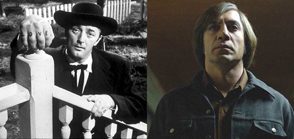 One of the best villain performers of Old Hollywood, Robert Mitchum achieved considerable success in film noir, starring as Reverend Harry Powell in The Night of the Hunter and Max Cady in Cape Fear. His relentless pursuit of two children in the former bears a resemblance to No Country for Old Men’s Anton Chigurh, as played to Oscar-winning perfection by Bardem. While less talkative than Mitchum’s maniacal preacher, Chigurh shares a desire to wipe himself clean of wrongdoing, exchanging the Lord’s work for fate and destiny within a coin toss. Mitchum and Bardem are both domineering presences and need say very little to achieve their desired effect. Their imposing frame and eerie expressions create the illusion of unstoppable monsters, even if they carry a sense of grace with their acts of cruelty.