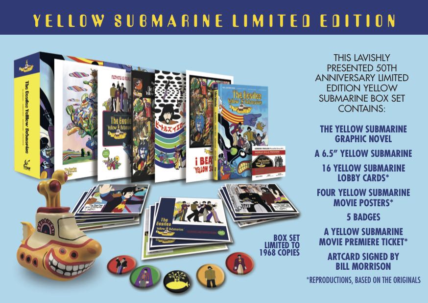 The box set is limited to 1968 copies, and features the critically acclaimed Yellow Submarine graphic novel, a 6.5-inch Yellow Submarine figurine/vinyl, 16 Yellow Submarine lobby cards plus four Yellow Submarine posters (based on the originals), five Beatles badges, a replica Yellow Submarine movie premiere ticket, and an exclusive art card signed by Bill Morrison, all lavishly presented in an illustrated box.