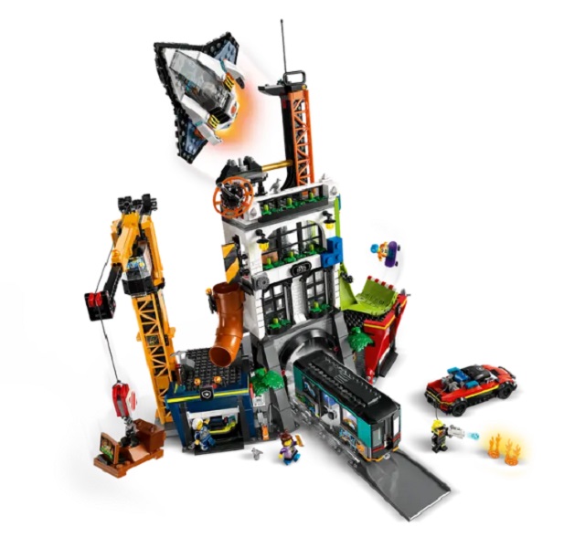 - What’s in the box? – Models include the city tower, a toy crane, metro train, spaceship and police and fire vehicles, plus 7 minifigures, including 5 characters from the LEGO® City No Limits TV show