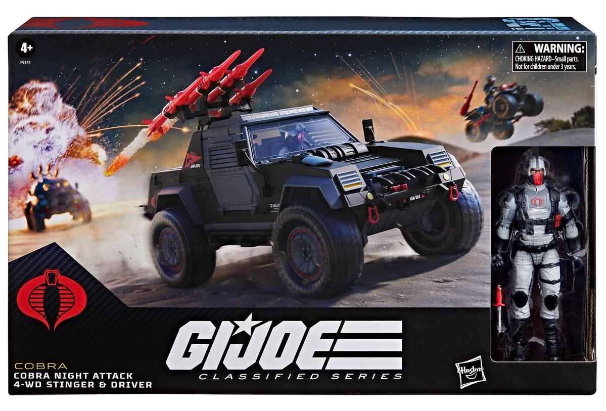 New to the G.I. Joe Classified Series line, Cobra Night Attack 4-WD Stinger & Driver comes ready for adventure, with multiple points of articulation for high poseability. This Driver figure contains 8 character-inspired accessory pieces including helmet, knife, removable sheath, and 3 weapon accessories. The Cobra Night Attack 4-WD Stinger comes packed with features including functioning wheels, suspension, armored-plated doors and roof, rear bumper plate with foot pegs, ram bar, dashboard display details, side mirrors, shovel, fire extinguisher 4 missiles, and 6 blast effect accessories.