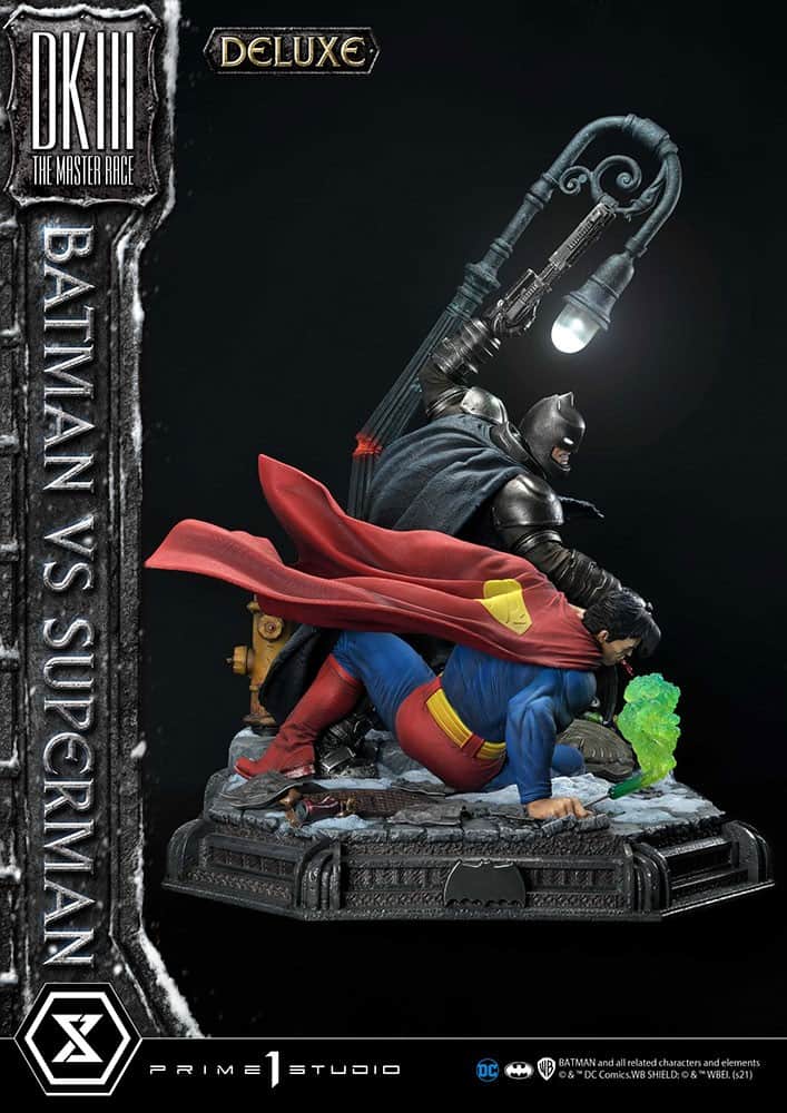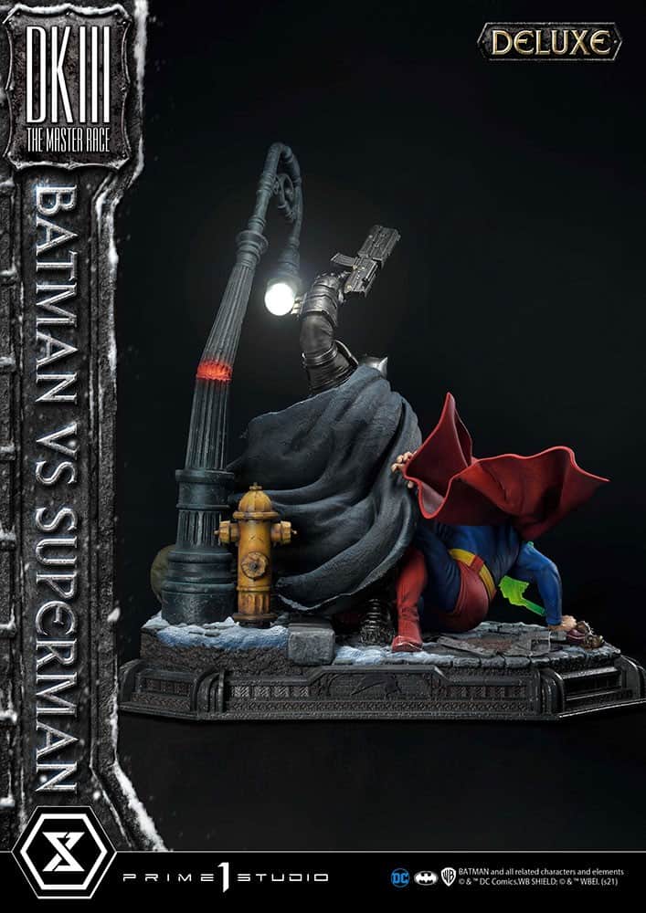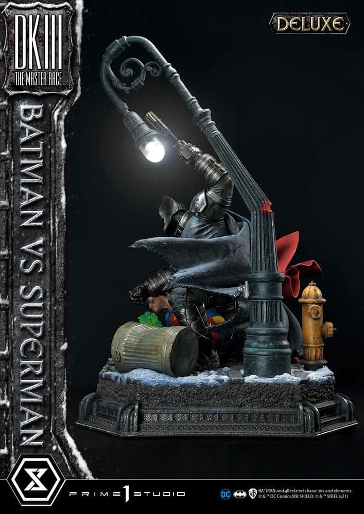 Coming in at a whopping 43 inches tall, our diorama statue freezes time at the exact moment Batman, decked out in state-of-the-art, anti-metahuman armor, lands a jaw-breaking punch on Superman! Situated in Crime Alley, at the site of Bruce Wayne’s parents’ murder by Joe Chill, our diorama includes insane detailing created by talented studio artists: Superman clutches an arrow emitting Kryptonite gas, shot by a one-armed Green Arrow; Batman, plugged directly into Gotham City’s power grid for his next powerful attack on Superman, the fabric texture of Superman’s iconic costume and the gritty reality of the world they are fighting in.