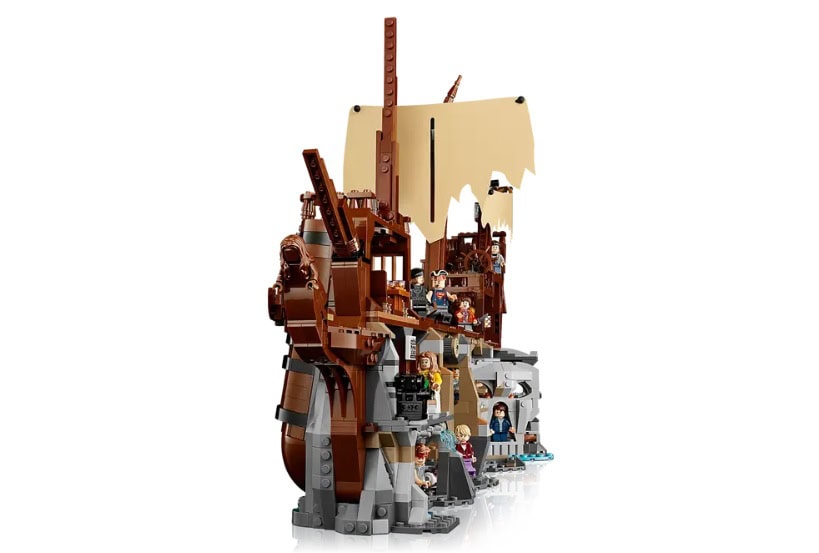 The set includes 12 LEGO minifigures of key characters from the movie and the interiors are packed with authentic details. Send a minifigure through the secret fireplace entrance to the caves. Activate the boulder-dropping trap. Use the Copper Bones Skeleton Key to release the trapdoor. Push the keys on the skeleton organ to break the floor and access the slide to the octopus (from a deleted scene). Send Sloth sliding down the mast on the Inferno deck.