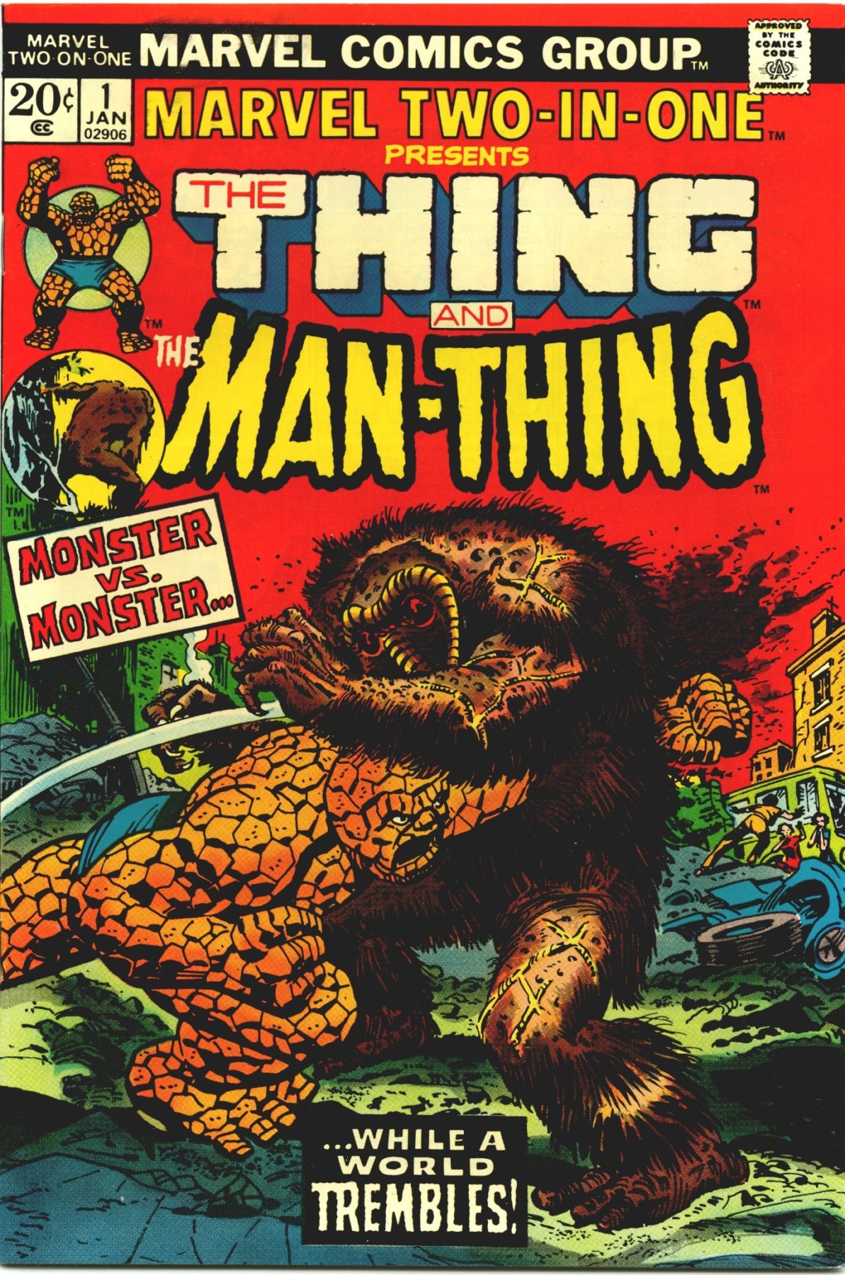 With issue #12, Marvel Feature saw cancellation in order to make way for an honest-to-god Ben Grimm solo series… sort of. Marvel Two-in-One Presents the Thing… would continue the team-up book format begun in the last issues of Marvel Feature, meaning our recurring star would perpetually be sharing the limelight with a revolving door of Marvel greats, and more than a few obscure upstarts. With issue #1, the aforementioned Steve Gerber takes up writing duties. Continuing the precedent set by Starlin & Co. in the final issue of Feature, Gerber immediately begins crossing over with his concurrent work on the Man-Thing character. Thing seeks Man-Thing, ostensibly to beat him up for having “Thing” in his name. Of course, the two join forces to fight the Son of Molecule Man, whom they watch age into dust.