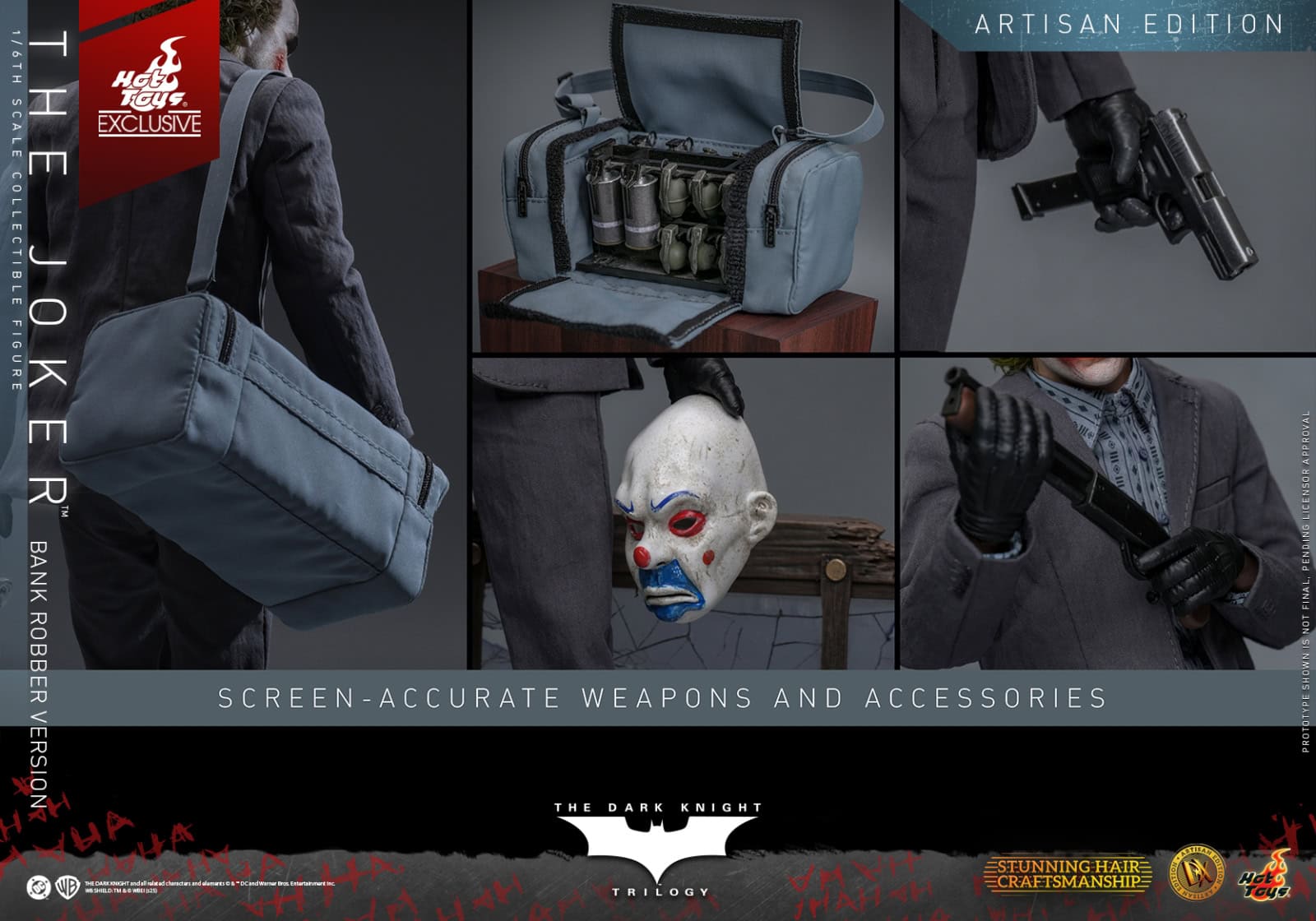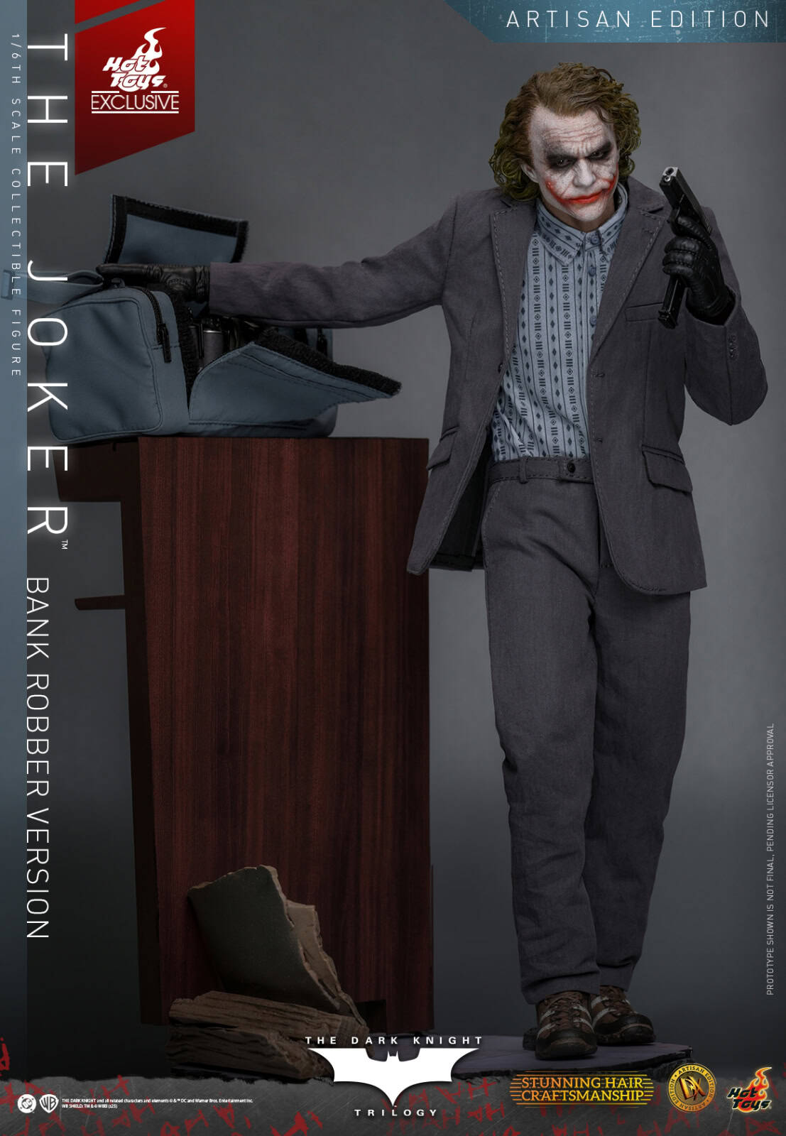 His outfit is recreated in incredible detail, from the striped shirt and grey blazer to the tailored pants, socks, and brown shoes, every piece contributes to a screen-accurate appearance. Newly developed interchangeable gloved hands allow for expressive posing, whether he’s holding a weapon, pulling a grenade pin, or casually toying with a Joker card. His deadly arsenal includes a pistol, shotgun, twelve-round grenades, four smoke grenades, a pull-string smoke grenade, and a grenade rack. Accessories such as the light blue duffle bag, stacks of cash, Joker cards, and the school bus backdrop enhance the storytelling display. Rounding out the release is a bank-themed diorama style base featuring interchangeable elements like shattered glass door and broken wooden boards. The Artisan Edition will also include a specially designed The Joker metal collectible card with display case.
