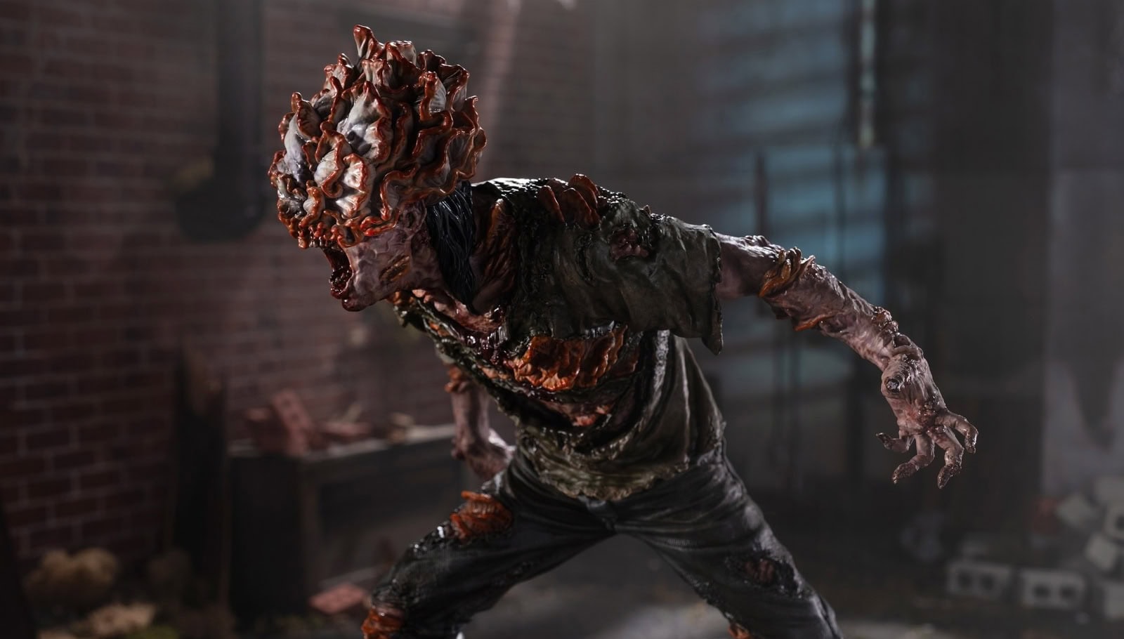 This Clicker 1:6 Scale Statue captures the horror of alerting one of the Infected as it shrieks, prepared for a vicious attack. Measuring 10.47” (26.6 cm) tall x 8.64” wide (22 cm) x 9.43” (24 cm) deep, the fully sculpted figure is covered in plates and shelves of cordyceps fungus bursting through the body, creating eerie, floral blooms amid torn clothes and discolored skin. The Clicker’s complex portrait features realistic paint and detailing, based on the designs seen in the show. The base depicts the wild and untamed fungal strain growing on crumbling urban features like pavement and a brick wall, the remnants of society being all but overtaken.