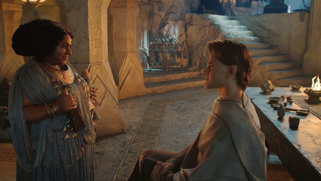 While Miriel’s tone often remains emotionally detached from whoever she’s speaking with, Addai-Robinson uses her body language and expressions to make Miriel an emotive character without relying on dialogue. This can be seen at the episode’s beginning with the newly born Númenorians or the way she looks at the falling petals of Númenor’s tree.
