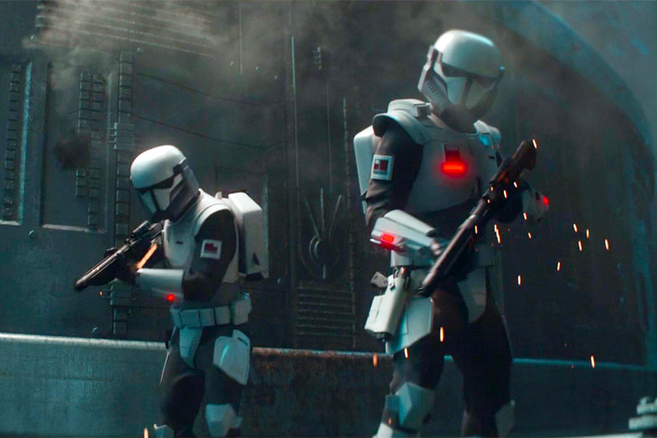 Moff Gideon’s newly designed army of Stormtroopers look incredibly cool, and we can’t help but draw many comparisons to the armor worn by First Order Stormtroopers. Sure, the armor may be in its early phases, as it doesn’t really cover much of their body (allowing for many opportunities to be shot around the Beskar), yet the helmet’s sleek design and costume’s higher percentage of black compared to original Stormtrooper armor make Moff Gideon’s new Stormtroopers look much like First Order Troopers.