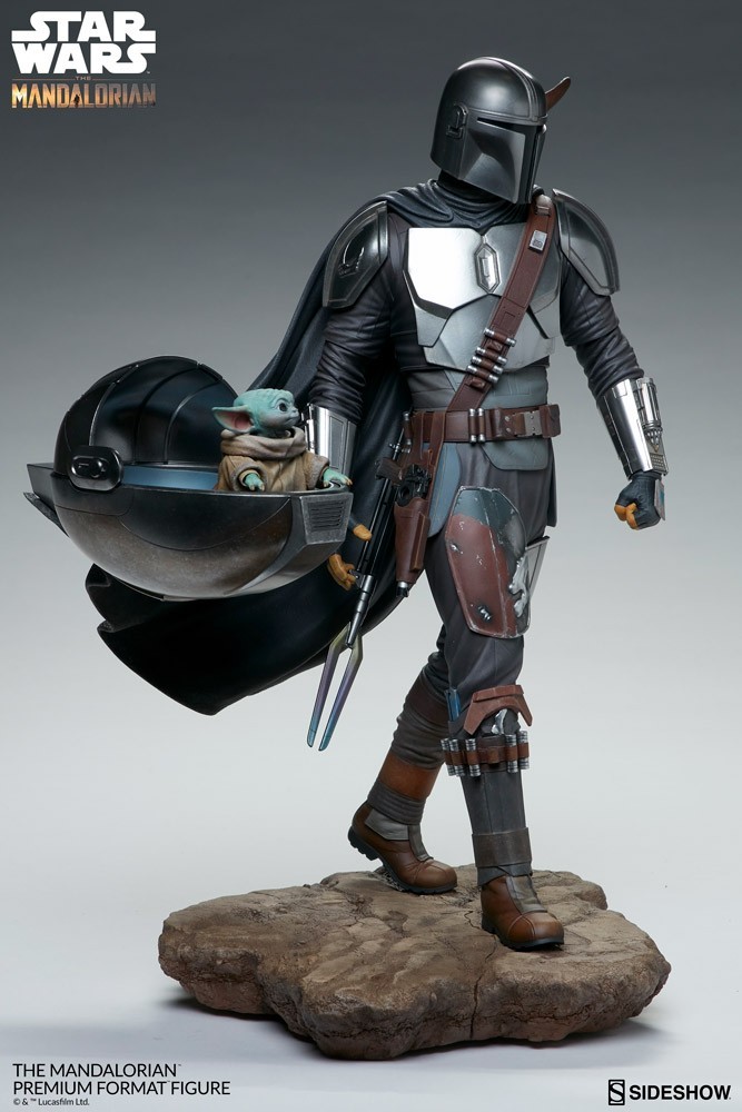 The polystone Mandalorian Premium Format Figure measures 20″ tall and is a detailed, dynamic, fully sculpted depiction of this renowned bounty hunter inspired by an iconic shot from the first season of the streaming series. Standing alongside the Child’s signature hovering pram, the Mandalorian braves the dangerous galaxy to protect what was once his prey. His silver armor reflects the hard work and weathering it took to acquire enough beskar to create each piece, complete with his mudhorn signet, the symbol given to him by the Armorer in accordance with Mandalore tradition. Equipped with his bounty hunting tools of the trade, The Mandalorian proves himself to be one of the galaxy’s most skilled and fearsome warriors.