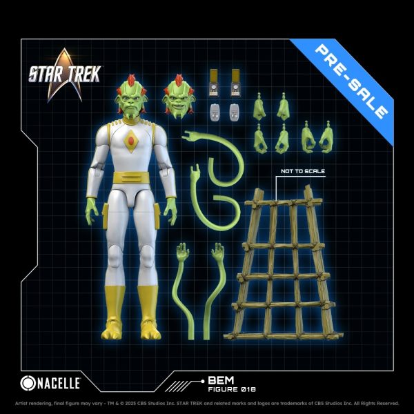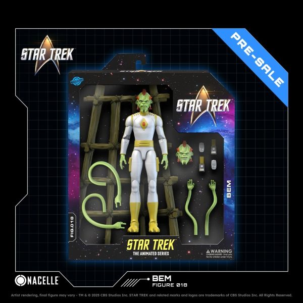 This one is picking up readings of Nacelle’s first Star Trek: The Animated Series action figure: Commander Ari bn Bem from planet Pandro! Like his two-dimensional counterpart, this 1/10-scale articulated figure separates into three portions using innovative magnetic connections, and can be placed behind the primitive fence to simulate this one’s captivity on Delta Theta III.