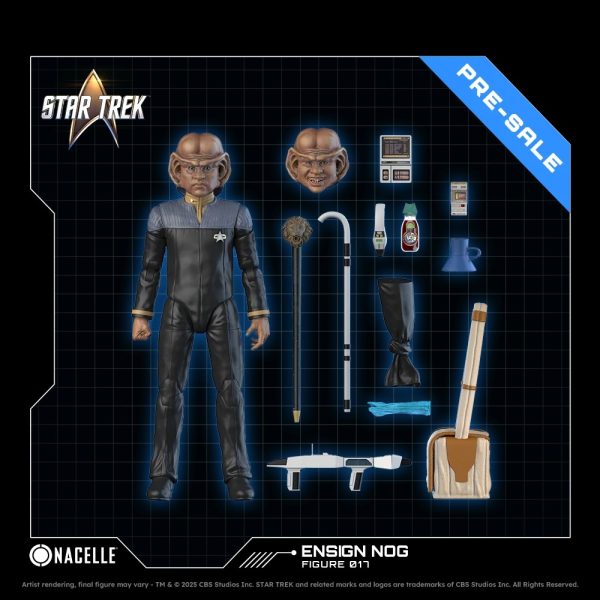 From precocious troublemaker to Starfleet hero, brave Ensign Nog has returned from the front lines of the Dominion War! This articulated 1/10 scale action figure portrays the young Ferengi in his first year of Starfleet duty, where he struggled to recover from a war injury, and rode the rapids of the Great Material Continuum aboard starbase Deep Space 9. Ensign Nog arrives with Starfleet gear like a phaser and phaser rifle, tricorder and padd, his travel bag, an interchangeable lower leg to reflect his injury at AR-558, a pair of canes, a bottle of his favorite Earth drink (root beer), and more.