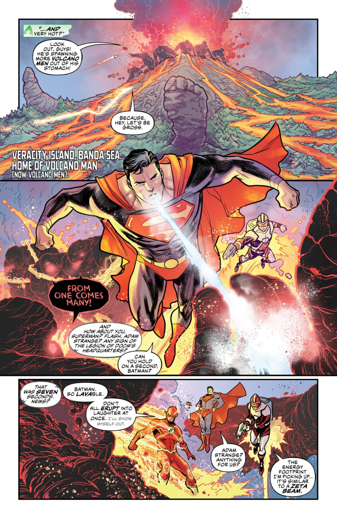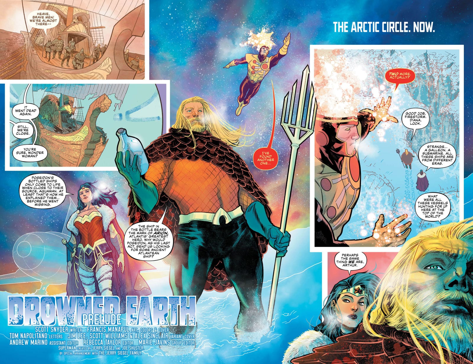 THE ROAD TO “DROWNED EARTH”! When Wonder Woman learns that Cheetah gained new powers and killed the Greek sea god, Poseidon, that sets Aquaman off on a search for answers, bringing him into conflict with an entity known as the Flood, a herald for long-dead ocean gods with an ancient grudge against Poseidon, Atlantis and, well, everyone else on Earth. Who are those guys? Some very big fish—and you know what big fish do? Eat smaller fish like Aquaman and his Justice League buddies!