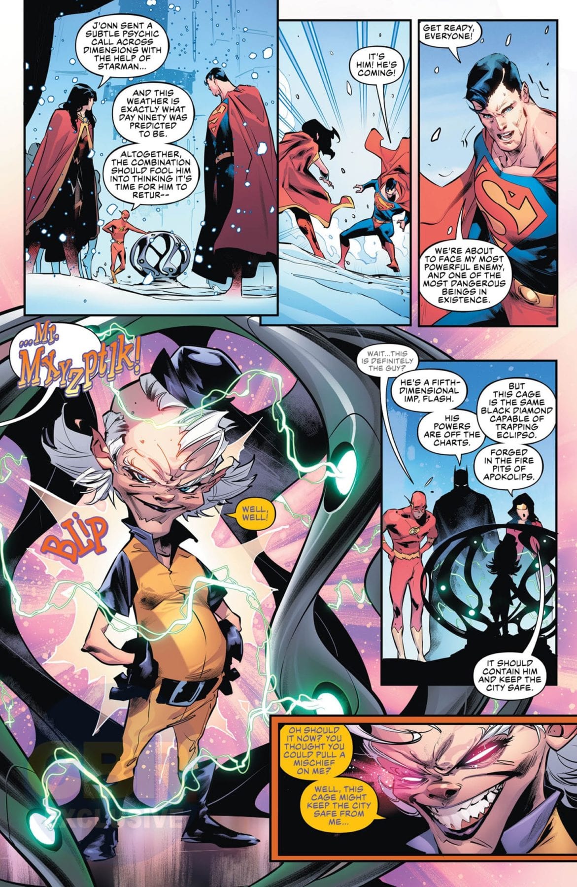 “The Sixth Dimension” part one! At last, the Justice League has the map to the Sixth Dimension in hand—and with it, they have the key to saving the Multiverse from utter destruction! But things aren’t as simple as they seem, because they still need to get to the doorway—and to do that, they’ll have to go through the only being in all of existence who can get them there: Mr. Mxyzptlk!