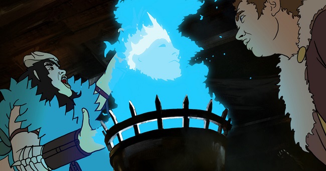 And keeping moving is the best thing for The Spine of Night as the rotoscope animation style is absolutely gorgeous, the characters moving with a fluidity that belies their less detailed appearance, and when combined with the painted backgrounds it creates an environment that very few – if any – live action movies have captured successfully. Against the beauty of the scenery there is the gore, where people and monsters get slashed and decapitated in scene after scene of ultra-violent swordplay, and characters such as Tzod, a swamp witch who walks around naked, which is something you don’t get in your average Saturday morning cartoon.