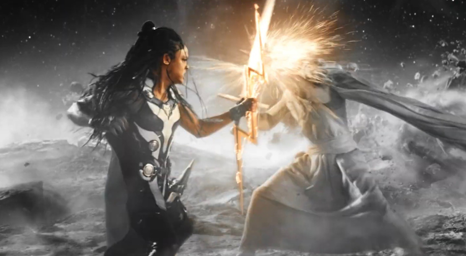 Meanwhile, Jane Foster is properly reintroduced and suffering from stage IV cancer. Naturally, she remains dedicated to bettering the world through science but is running out of time, which eventually brings her to New Asgard (a fishing village/tourist attraction on Earth) upon learning that something (I won’t spoil what) might be capable of curing her. It’s not long before Jane becomes a Thor herself (dubbed Mighty Thor and, in a funny running bit, is incapable of delivering a solid one-liner before finishing off Gorr’s shadow monster henchmen) and becomes embroiled in the quest to save the unknowing gods, and more importantly, children that Gorr has brought to his playground (a visually dazzling monochrome space that resembles the moon) to spring a trap and lure Thor and company there.