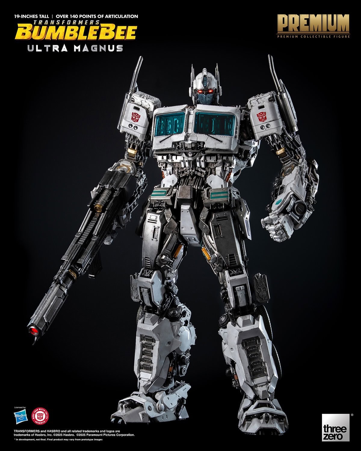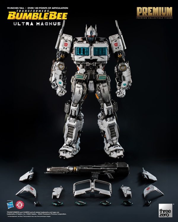 With a premium pearl white paint finish, the Transformers: Bumblebee PREMIUM Ultra Magnus stands an impressive 19 inches tall and features approximately 143 points of articulation for maximum poseability, including individually articulated fingers. The figure is built on a sturdy die-cast metal frame, providing impressive weight and a premium tactile feel. Expertly crafted with an ultra-detailed sculpt and threezero signature weathering paint, the figure cleverly combines different materials to enhance realism.