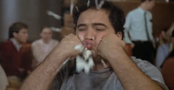 Sure, the gross-out gags in this movie are relatively tame by today’s standards, yet looking back at Animal House, you’ve got to hand it Belushi and his gleefully unhinged comedic act. At one point, he engages in a food fight in the cafeteria and impersonates what it’s like to be a “human zit” by stuffing a fistful of mashed potatoes before he spits them out after puffing out his cheeks using his fists. Interestingly, the infamous “human zit” gag was entirely improvised, showcasing Belushi’s ingenious flair for improv comedies.