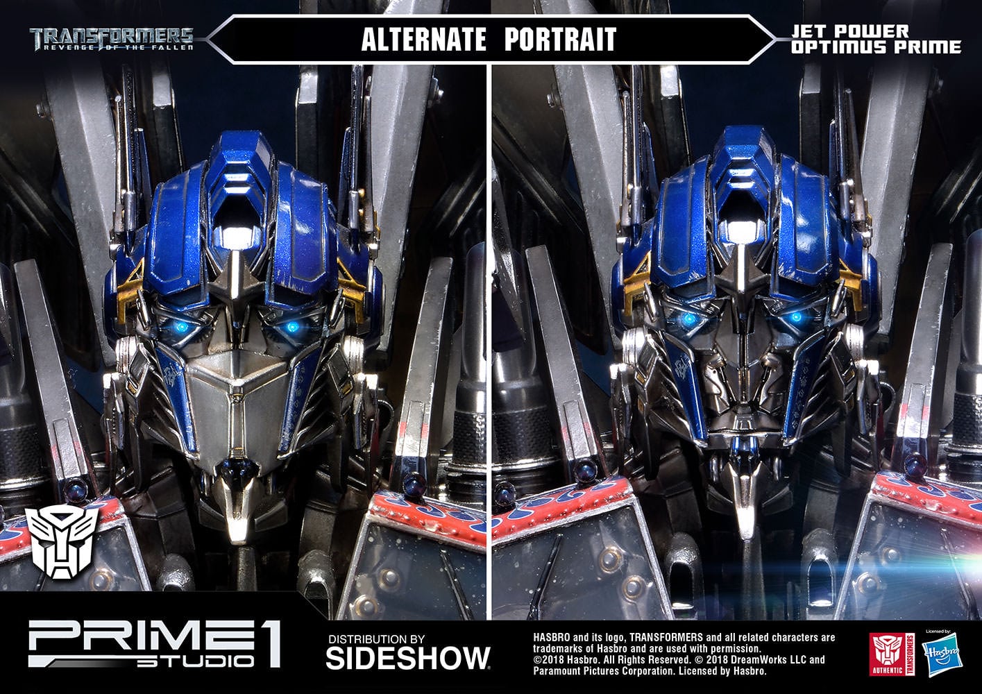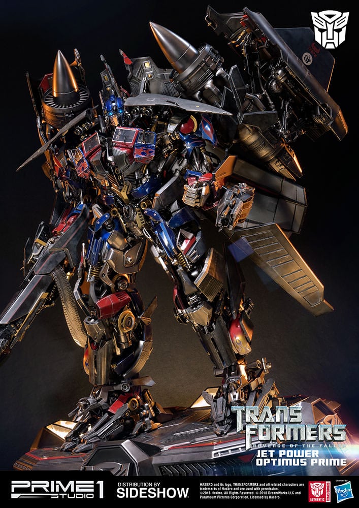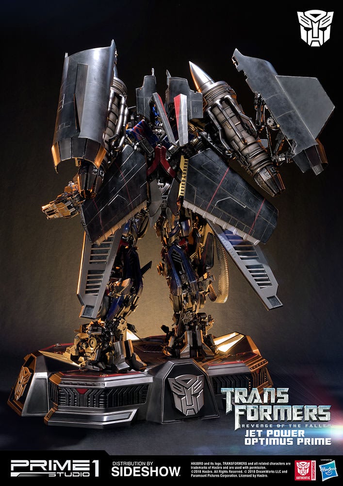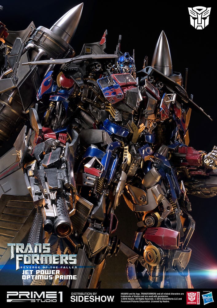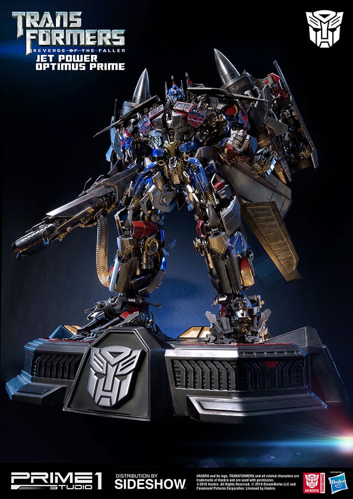 Sideshow and Prime 1 Studio are proud to present the Jetpower Optimus Prime from Transformers: Revenge of the Fallen. Transformers (ROTF) is a 2009 science fiction action film. It is the sequel to 2007’s Transformers, as well as the second installment in the live-action Transformers film series. Jetpower Optimus Prime is the upgraded form of Optimus Prime with Jetfire’s parts. In this form, Optimus possess various weapons, including a cannon on his arm, a machine gun, at least one of his swords from his normal mode and both afterburners on his back which can fire massive energy blasts as well.
