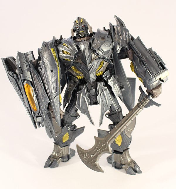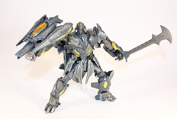 The first thing to note about this figure is that it is very detailed (which is expected, given that it’s from the high-end Leader Class series of figures), and – cannon aside – it delivers a fairly faithful interpretation of Megatron’s design from the latest Michael Bay movie. Sure, it’s not as movie accurate as a Hot Toys for example, but considering it actually needs to have the ability to transform, the designers have certainly done a solid job in this area. It also comes with his giant sword/axe weapon, which immediately adds a couple of cool points.