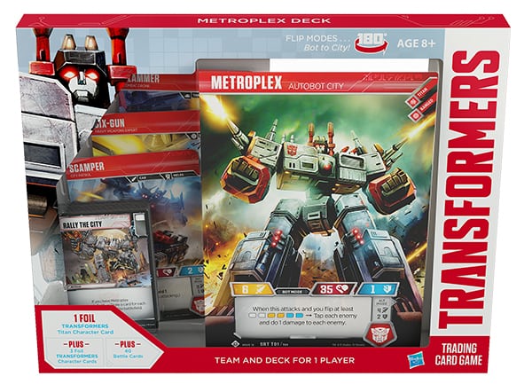 The METROPLEX Deck contains the cards for one player to bring the Titan METROPLEX into the TRANSFORMERS Trading Card Game experience. It features the METROPLEX, SCAMPER, SIX-GUN, and SLAMMER character cards and a 40-card deck of battle cards including three battle cards–Rally the City, Height Advantage and Protected by Metroplex—not available in the AUTOBOTS Starter Set or the TRANSFORMERS Trading Card Game Booster Packs.