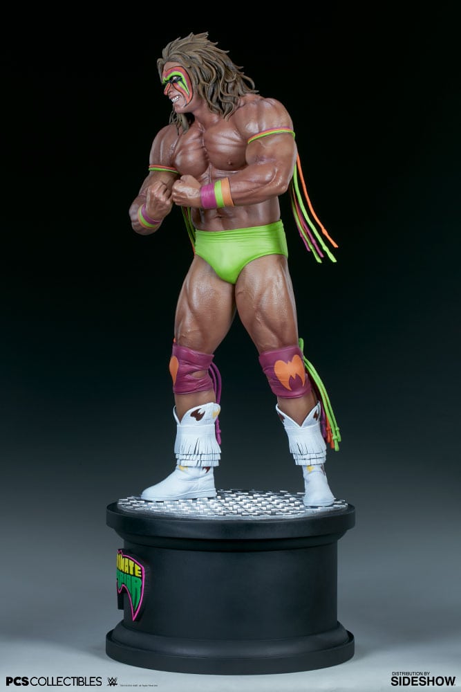 Known for his vibrant colors and unstoppable energy, the Ultimate Warrior Statue embodies the strength and true spirit of the wrestling superstar. His portrait is detailed with his signature wild hair and bright face paint in orange, pink, green, and black. The Ultimate Warrior is costumed in color-matching tassels, wristbands, and knee pads, as well as green trunks and white fringed boots all sculpted with realistic, fabric-like textures.