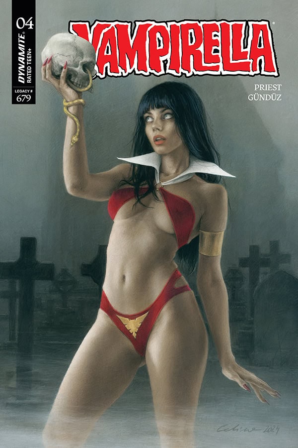The immortal comics team of writer CHRISTOPHER PRIEST and artist ERGÜN GÜNDÜZ ratchets up the tension in Vampirella #4 balanced by endearingly eye-catching covers from LUCIO PARRILLO, GREG LAND, CELINA, ELIAS CHATZOUDIS, and cosplay by RACHEL HOLLON!