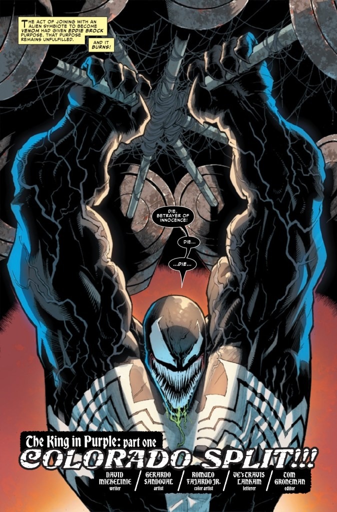 LONG LIVE…THE KING IN PURPLE! AMAZING SPIDER-MAN legend and VENOM co-creator DAVID MICHELINIE triumphantly returns to tell another all-new, heart-pounding, brain-eating tale set in EDDIE BROCK’S earliest days! This time, he’s teaming up with VENOM and DEATH OF THE VENOMVERSE artist extraordinaire GERARDO SANDOVAL! Venom has made a new enemy. And their bond will be tested like never before when a foe with the power to alter reality itself threatens to tear Eddie’s world apart, starting with his symbiote!