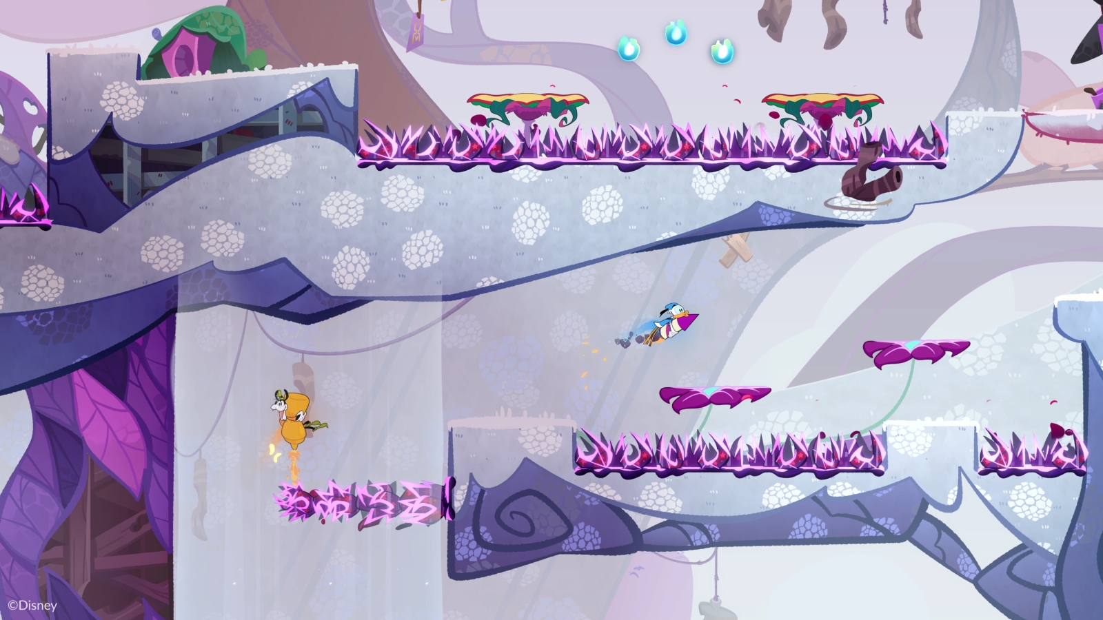 Meanwhile, there is an amusing running-gag about how Donald always gets shortchanged with whatever unwanted garbage is left lying around, as a kind of afterthought. His wall-anchor is just a toilet plunger and, to execute a basic double-jump, he has to clutch onto a volatile rocket that’s prone to exploding. Mickey, on the other hand, gets a proper jetpack.