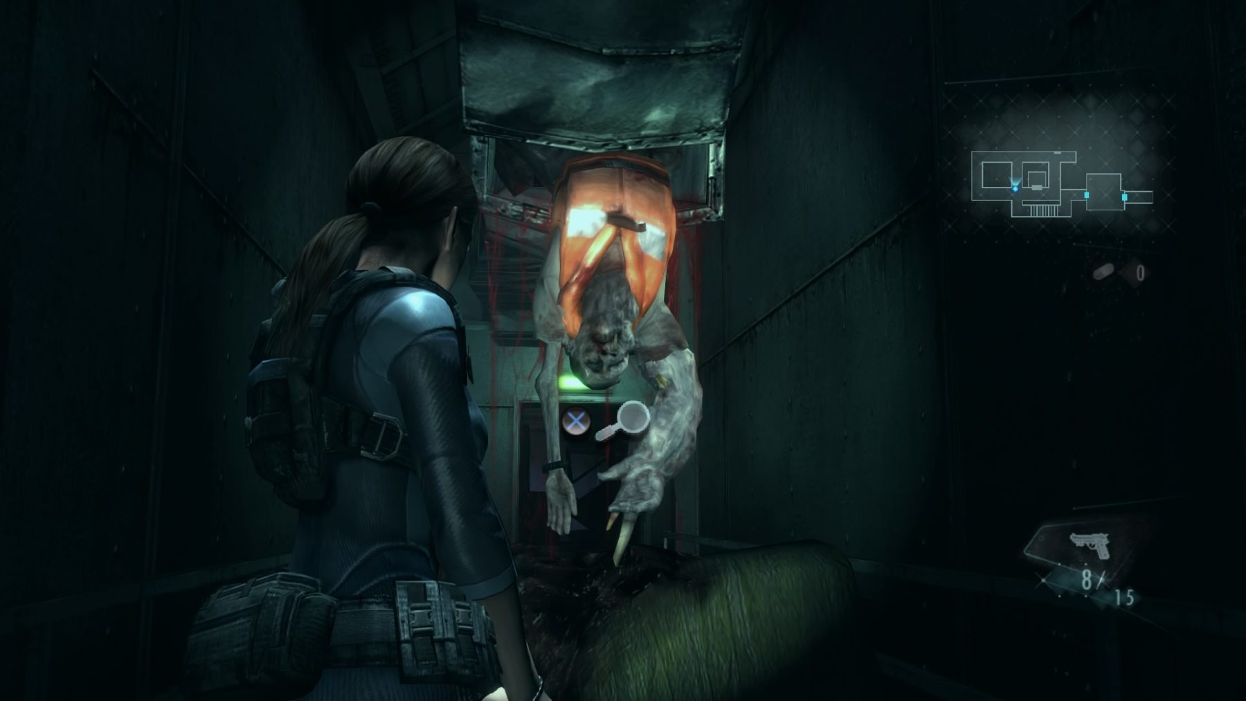 Revelations isn’t exactly ‘scary’, the enemy design is more abstract and gross this time around as opposed to scary. Although, the tone is kept dark and occasionally enemies will drop from the ceiling, behind you, which was absolutely terrifying. It’s seems hard to get the dichotomy right to the point where you can spook players, while actually giving them adequate tools to deal with a problem. If my pockets are chock-full of shotgun shells and grenades – I’m not going to fear most encounters. Saying this, Capcom go extra weird with enemy design choices this time and you’ll be consistently challenged throughout. Some of it feels like a genuine challenge, but as typical in survival horror games, some deaths and hard spots feel like total bullshit designed to drain your resources and put you on the back foot. I find it hard to argue with the concept too much because it does work and it is effective in making you panic, taking you out of your comfort zone and forcing you to take the next encounter a bit more seriously without a stock of heavy explosives.