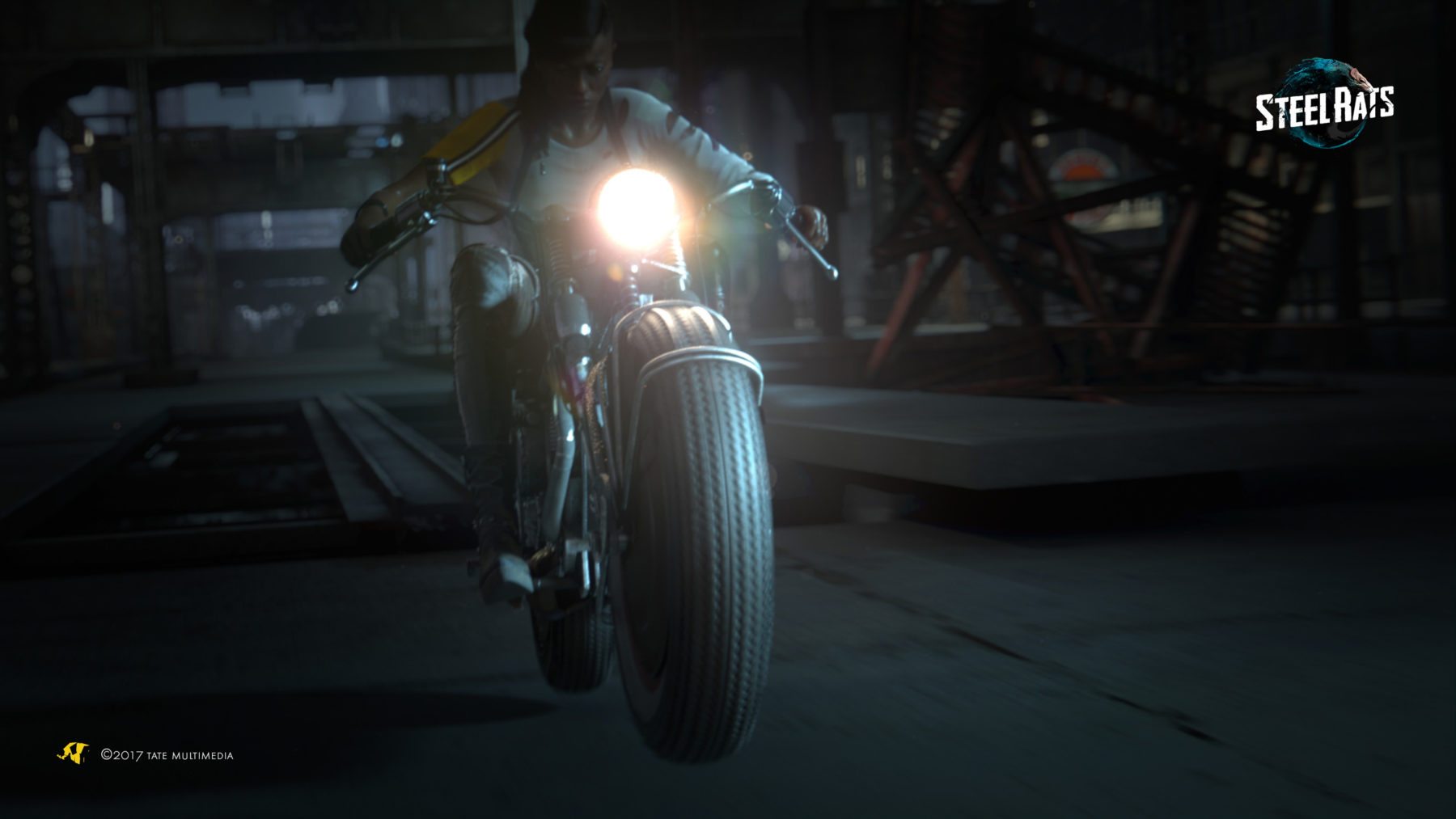Readers who track the motorcycle subgenre of racing video games may recognize Tate Multimedia from their subsidiary Tate Interactive, which was behind the stunt bike series Urban Trial, the latest entry of which, Urban Trial Playgrounds, was released on the Nintendo Switch. Thus, it’s not surprising to see the company use that motocross template for Steel Rats. Set in the urban world of Coast City where technological innovation is brewing under the surface, Steel Rats follows a biker gang of the same name as they face a massive invasion of robotic drones.